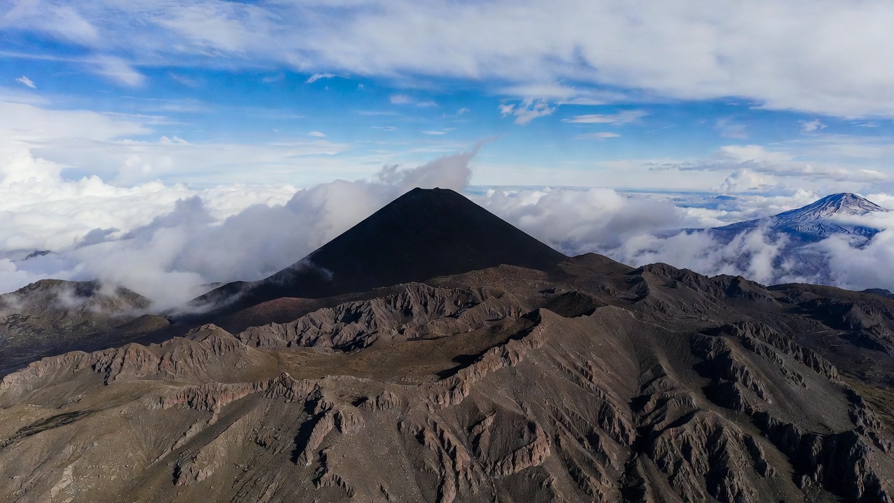 Andes volcano, aerial view, blue sky, clouds, cone, elevation, high altitude, landscape, misty clouds, mountain, nature, peak, rocky terrain, rugged slopes, stratovolcano, summit, volcanic mountain, volcano