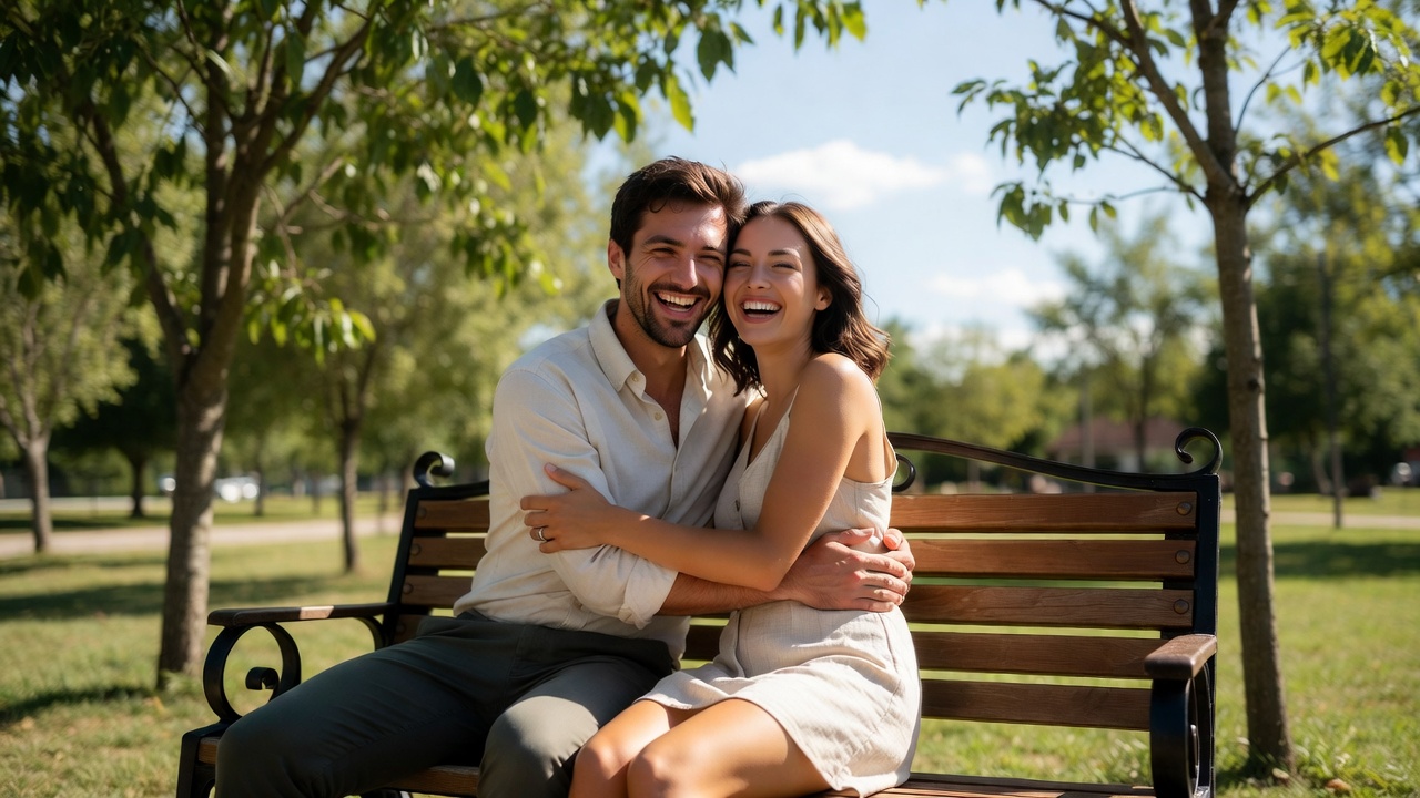 A smiling man with dark hair hugs a smiling woman with long dark hair on a wooden park bench. They are dressed in light-colored summer clothes, with green trees and a blue sky in the background. The bench has ornate metal armrests and sits on green grass.