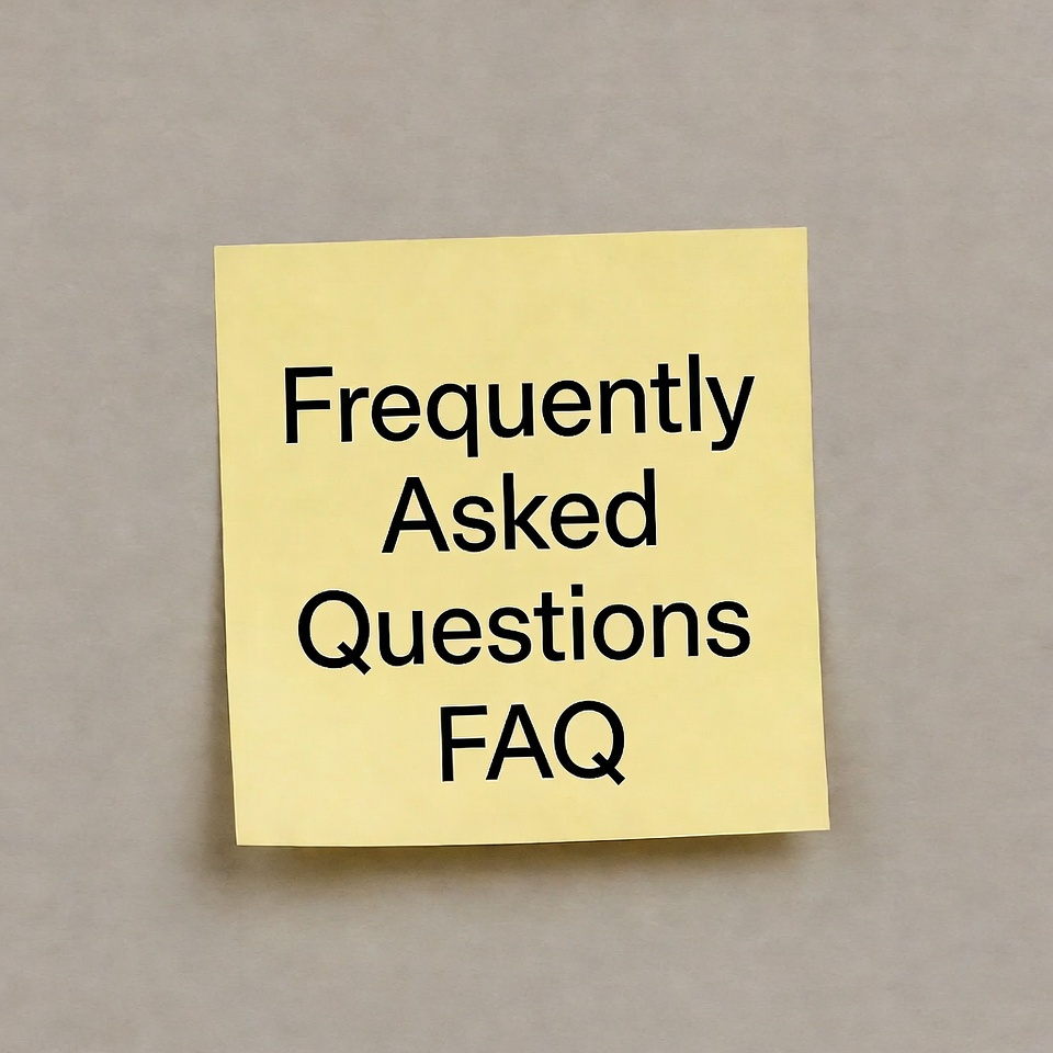 A yellow sticky note with 'Frequently Asked Questions FAQ' written in black text is placed on a light gray background. The note is rectangular and slightly curled at the edges. The text is bold and centered on the note.