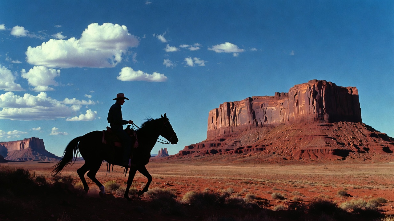 A black silhouette of a cowboy wearing a hat rides a horse in the foreground against a vibrant blue sky with white clouds. Towering red rock formations of Monument Valley rise dramatically in the background. The scene features a vast desert landscape with sparse vegetation.