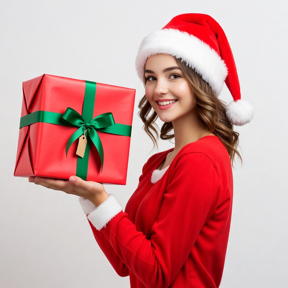 A smiling young woman with curly hair wears a red Santa hat and red sweater with white trim. She holds a large red gift box wrapped with a green ribbon and bow in her hands. The image features a white background.