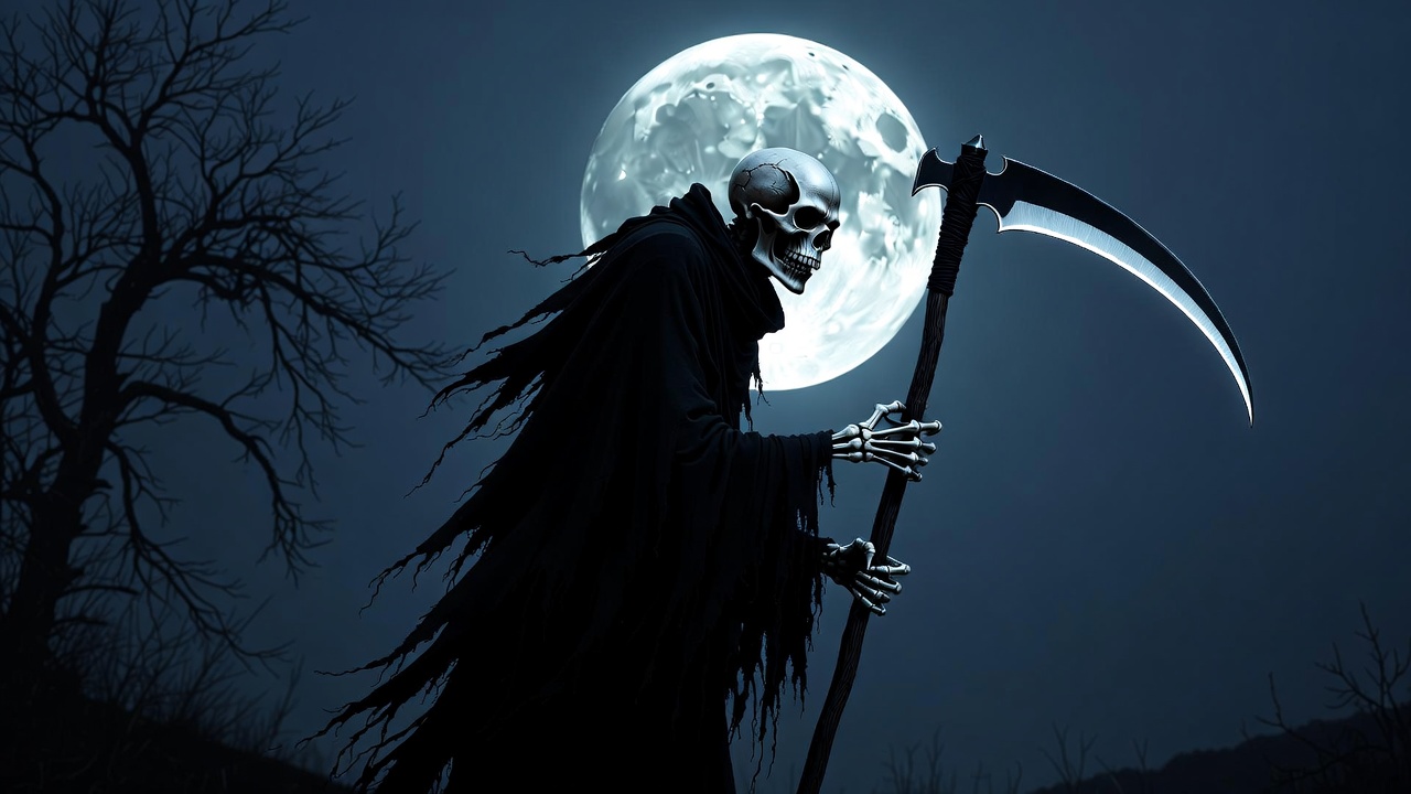 A skeletal Grim Reaper in a tattered black cloak holds a large scythe while standing in a dark night scene. A full moon illuminates the background with bare dead trees silhouetted against the sky. The figure's bony hand grips the scythe handle firmly.