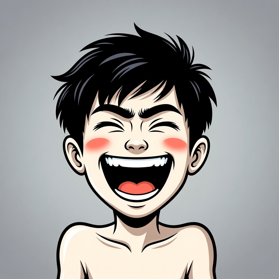 A cartoon illustration of a young Asian boy with messy black hair laughing heartily on a gray background. He has squinted eyes, wide open mouth showing teeth, and pink blush marks on his cheeks. His upper body is bare and depicted in a bold, expressive anime style.