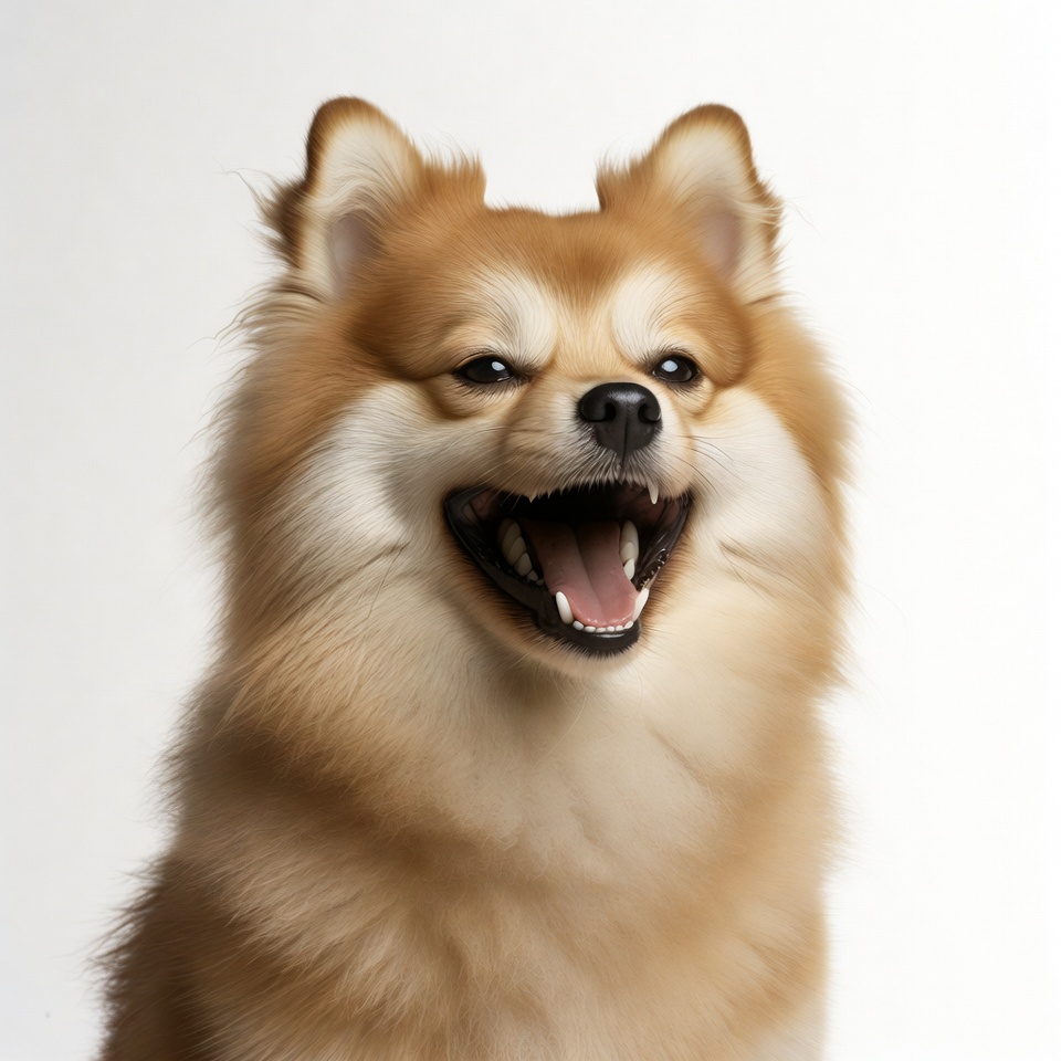 A fluffy Pomeranian dog with reddish-brown fur and white markings on its face and chest stands on a plain white background. The dog faces forward with its mouth wide open in a bark, revealing its teeth and tongue. Its pointed ears are perked up and eyes are alert.