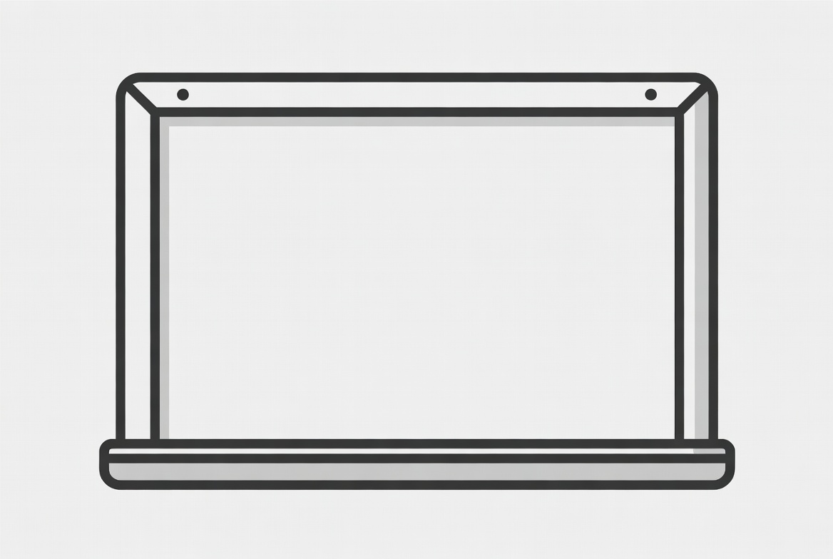 A simple line art illustration of a rectangular picture frame with a blank white space inside. The frame features thin black outlines and small hanging hooks on the top corners. It stands on a subtle base against a transparent background.
