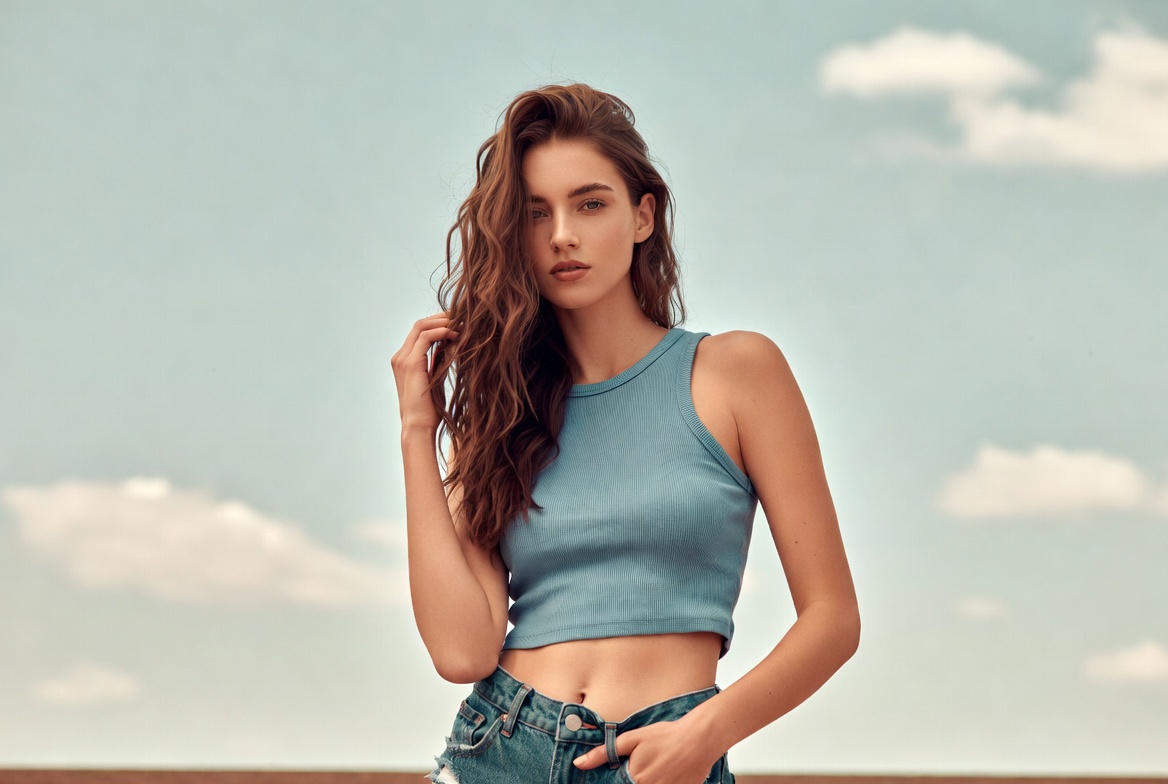 A young woman with long wavy brown hair stands confidently against a bright blue sky with scattered clouds. She wears a cropped blue tank top exposing her midriff and light blue ripped jeans. She poses with one hand on her hip and the other touching her hair.