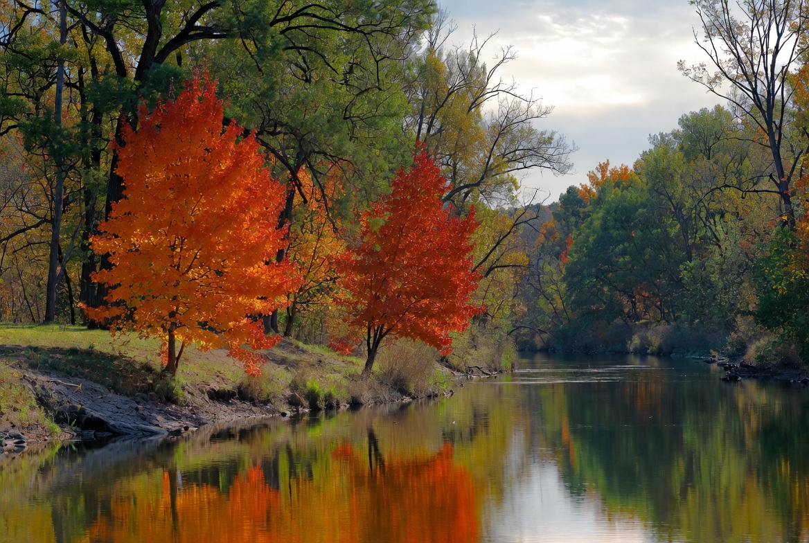 Vibrant orange and red maple trees line a calm river in autumn, with their colorful reflections shimmering in the water. Green and yellow trees surround the scene under a partly cloudy sky. The riverbank features grass and gentle slopes.