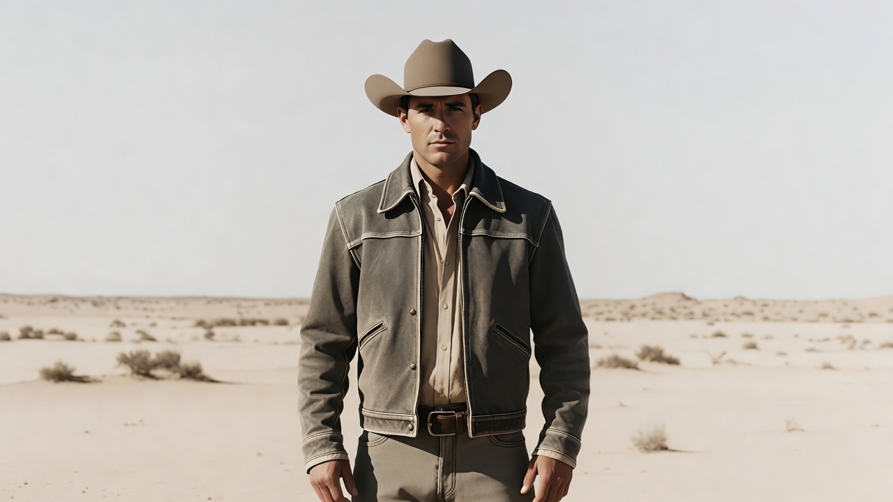 A man wearing a wide-brimmed brown cowboy hat stands confidently in a vast sandy desert. He is dressed in a gray fringed jacket over a light shirt, dark pants, and boots. Sparse desert bushes surround him against a clear horizon.