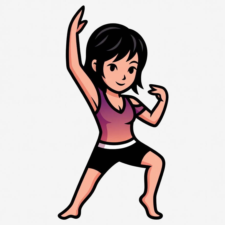 A cartoon Asian woman with short black hair strikes a dynamic dance pose on a white background. She wears a purple tank top and black shorts, raising one arm high and flexing her bicep with the other. Her expression is cheerful with large eyes and a smiling mouth.