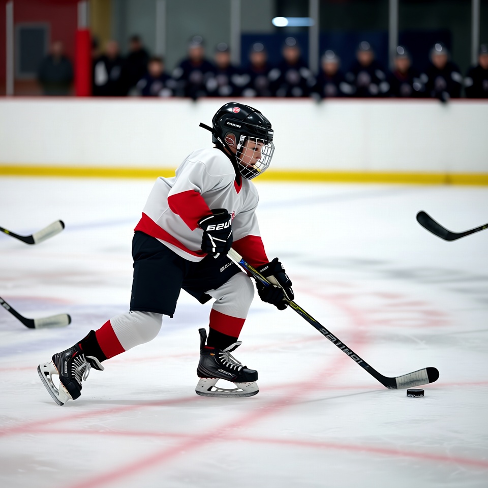 A young boy in a black helmet with face shield and white, red, and navy hockey uniform skates on an ice rink while holding a hockey stick. He appears to be shooting or handling the puck with sticks and gear scattered nearby. Spectators in dark clothing are visible in the blurred background behind the glass.