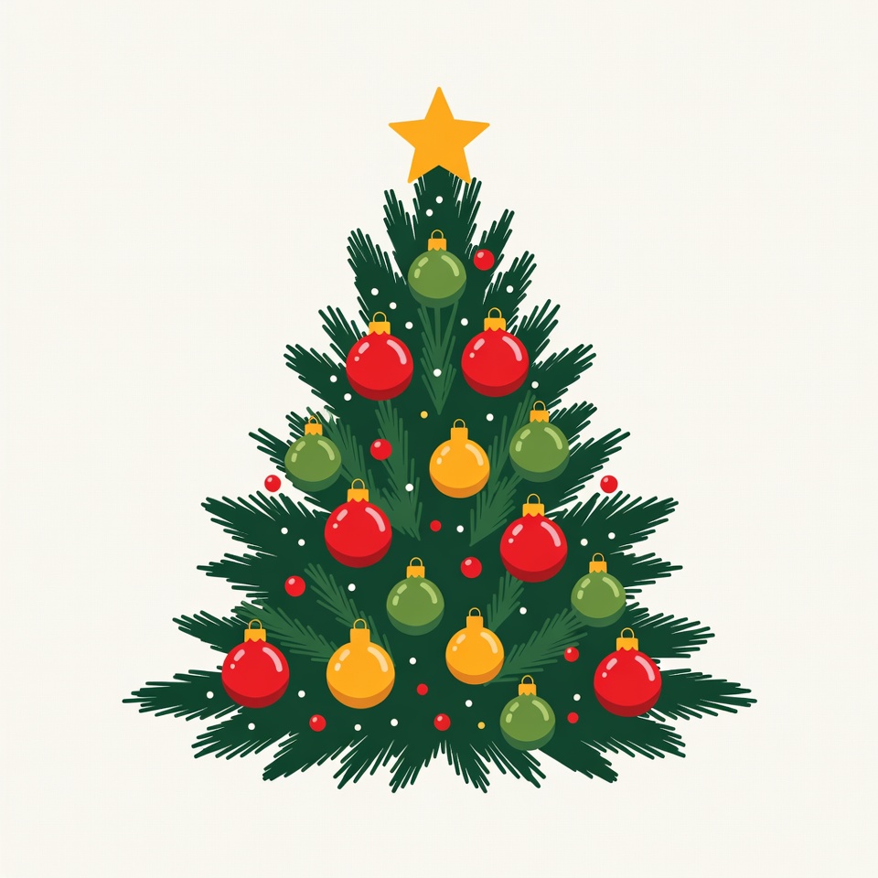 A vibrant green Christmas tree illustration features a golden star on top and colorful ornaments including red, green, gold, and yellow balls. The tree stands on a plain white background with simple vector-style branches and decorative lights. It is fully decorated for the holiday season.