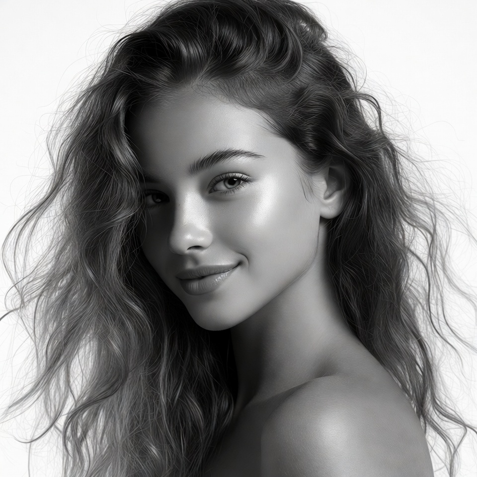 attractive, beautiful, black and white, closeup, dark hair, dewy skin, eyes, face, female, glowing skin, hair portrait, headshot, lips, long hair, monochrome, portrait, smiling, wavy hair, white background, young, woman