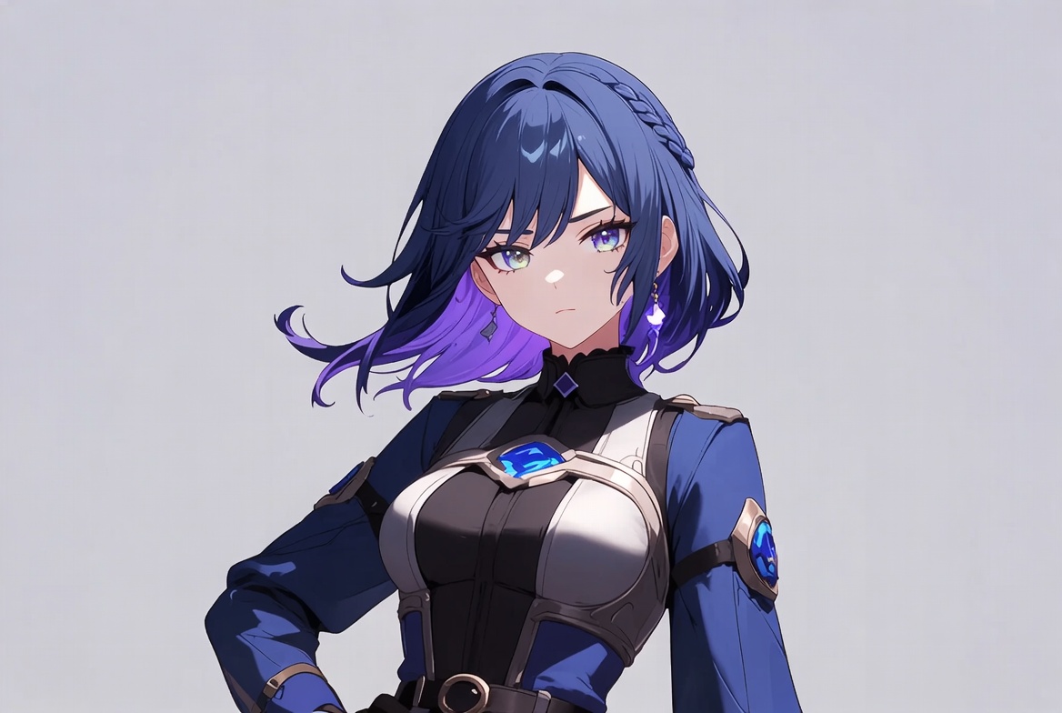 An anime illustration features a young woman with long blue hair tipped in purple, styled in twin tails. She wears a form-fitting blue and white military-style uniform with glowing blue accents and a high collar. She stands confidently with hands on hips against a plain gray background.