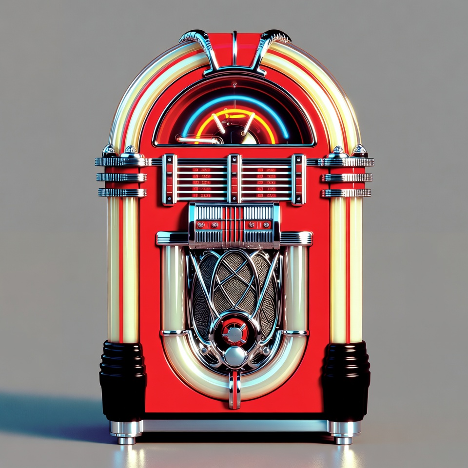 1950s jukebox, 3D render, chrome accents, classic jukebox, glowing display, isolated background, metallic grille, music machine, neon lights, red jukebox, retro jukebox, rockola jukebox, speaker vents, vintage jukebox, wurlitzer style, jukebox