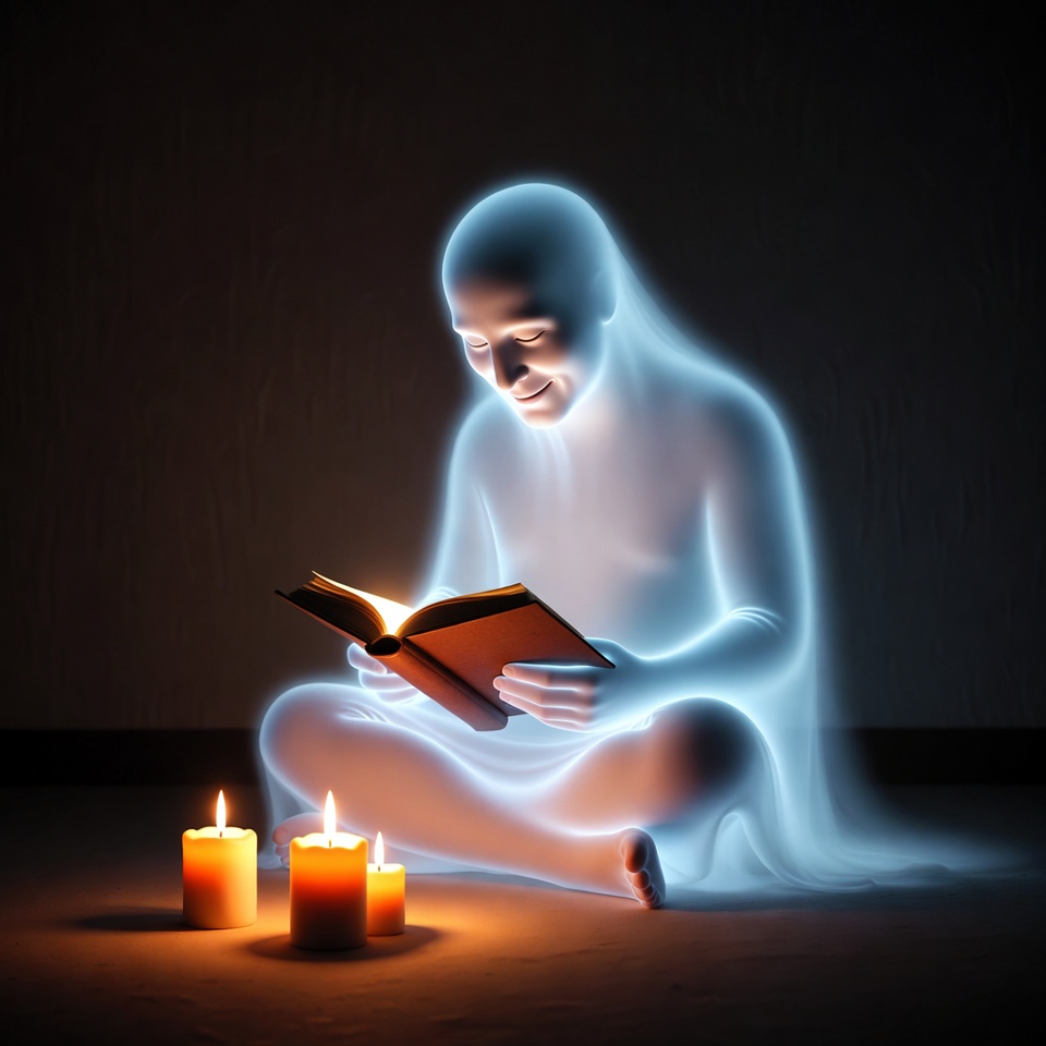 A translucent glowing ghost figure with a bald head sits cross-legged on the floor, reading an open book. The ghost emits a blue ethereal light and is surrounded by several lit orange candles on a dark surface. The scene features a mystical digital illustration style with soft lighting.