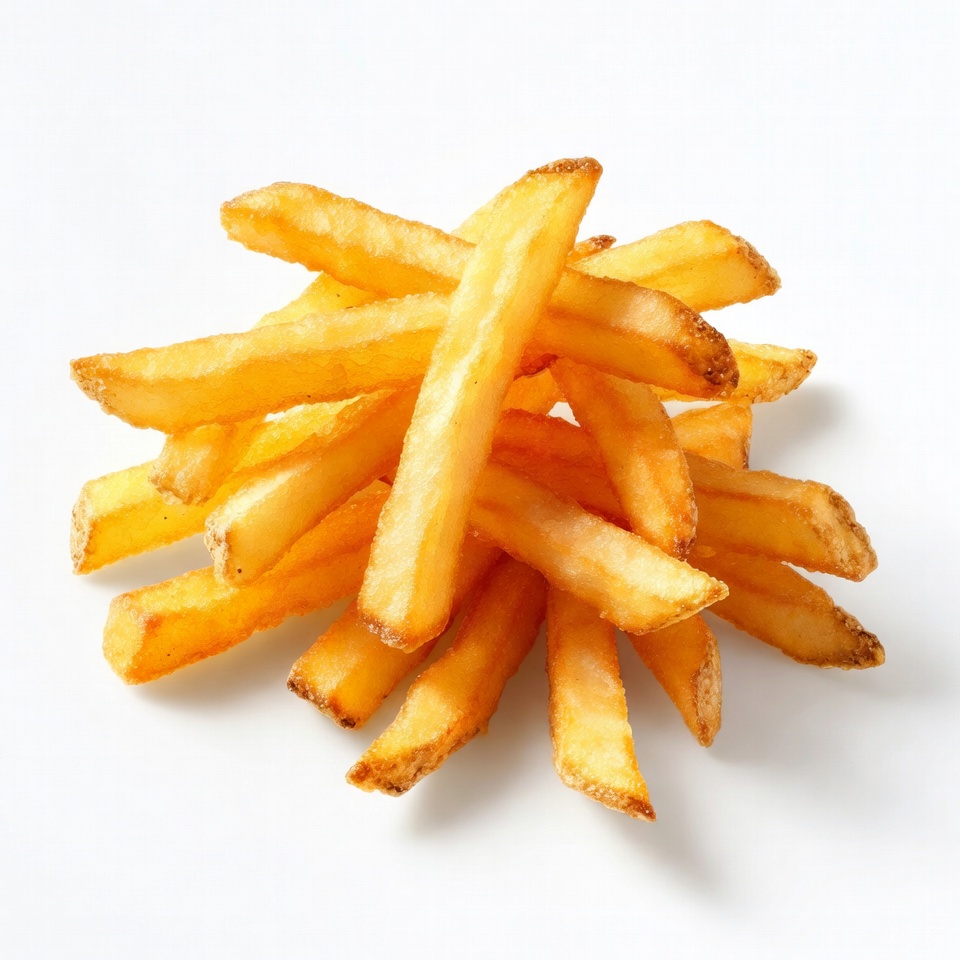 A pile of golden french fries is arranged on a white background. The fries are crispy with textured surfaces and varying lengths. They are isolated for a clean, appetizing presentation.