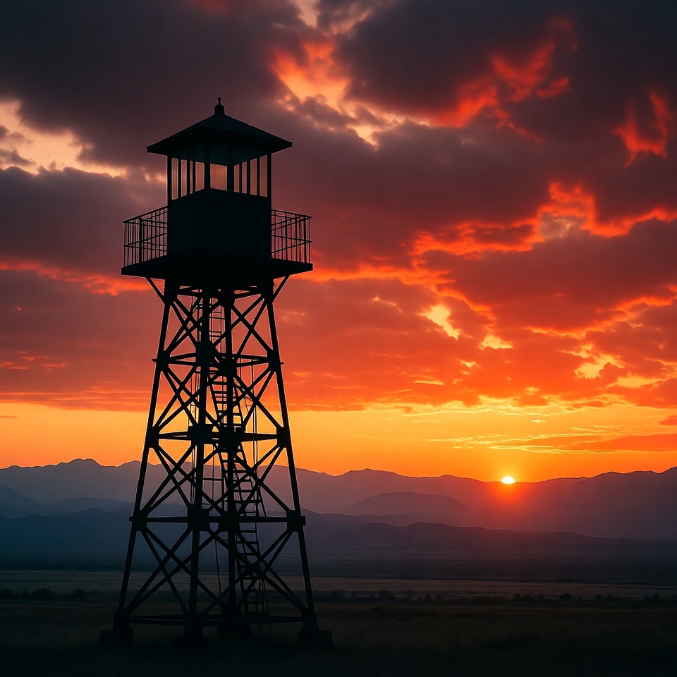 dramatic sky, dusk, evening sky, fiery sunset, grass field, guard tower, horizon, landscape, metal tower, mountains, orange sky, red clouds, silhouette, sunset, tower, watchtower