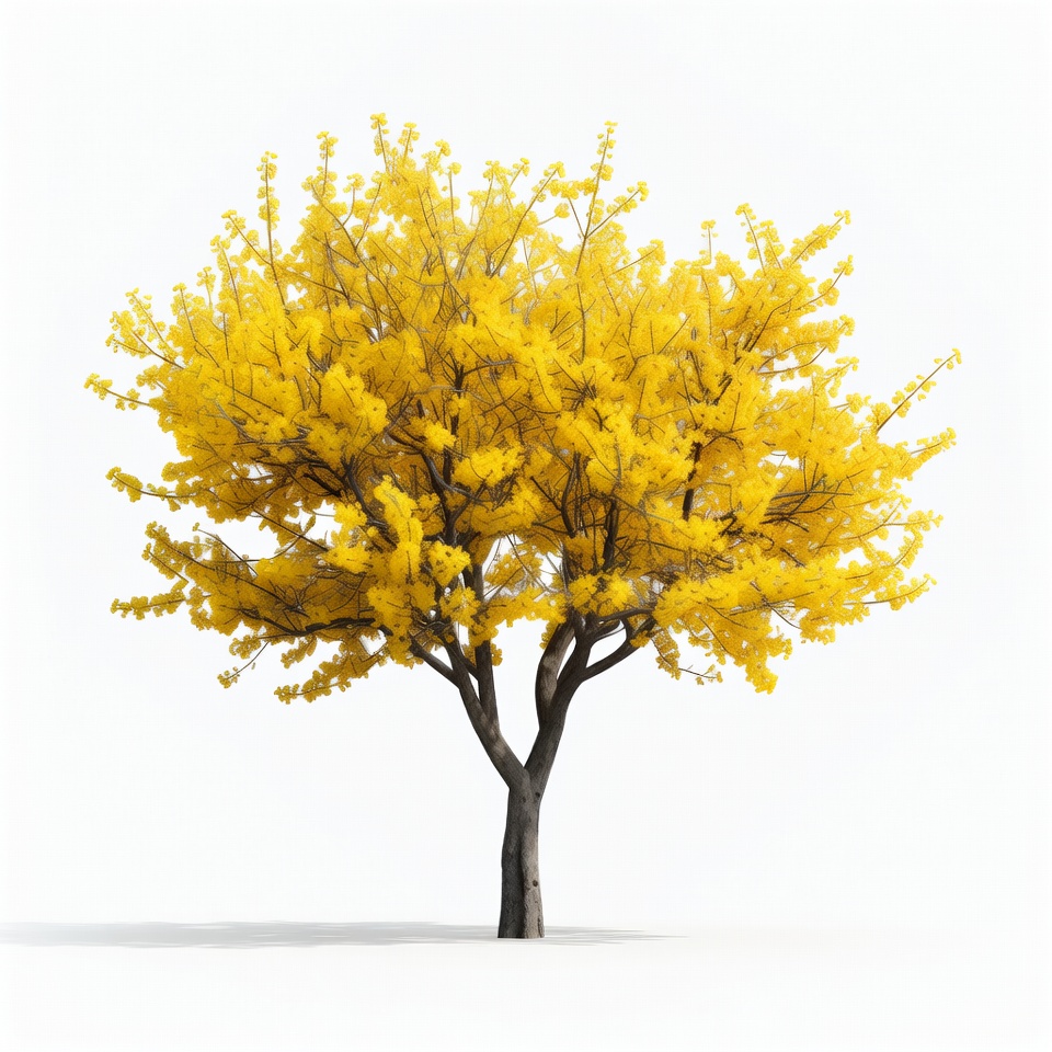 A vibrant yellow flowering tree stands against a plain white background. The tree features dense clusters of small yellow blossoms covering its branches. It has a sturdy trunk and is rendered in a realistic 3D style.
