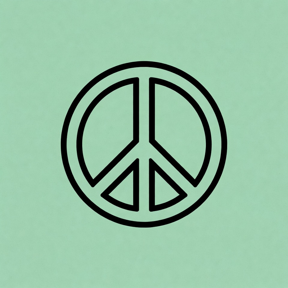 A bold black peace symbol is centered on a solid mint green background. The iconic circular design features the classic peace sign with forked lines. It appears as a simple line art graphic.