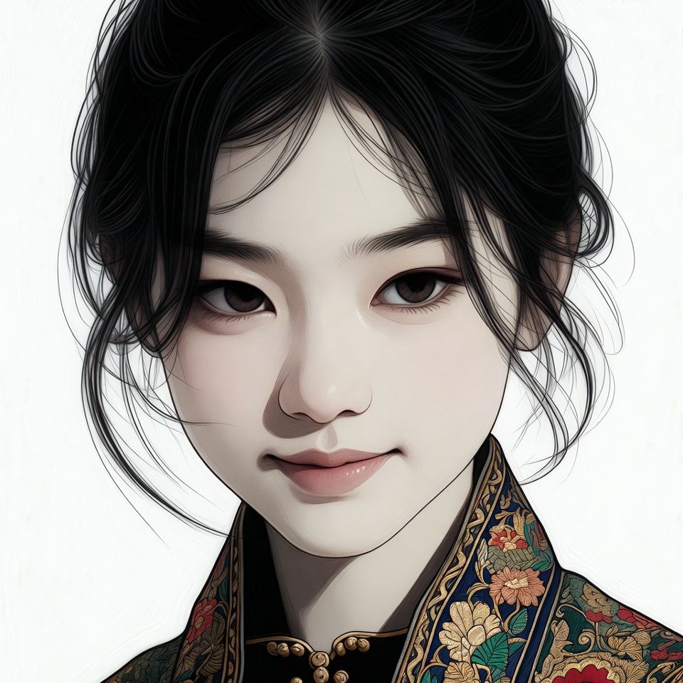 A young Asian woman with long black hair styled in loose bangs faces forward with a gentle smile. She wears an ornate traditional Chinese hanfu featuring intricate floral embroidery in gold, red, and green on a dark collar. The digital illustration highlights her fair skin, almond-shaped eyes, and elegant facial features against a plain background.