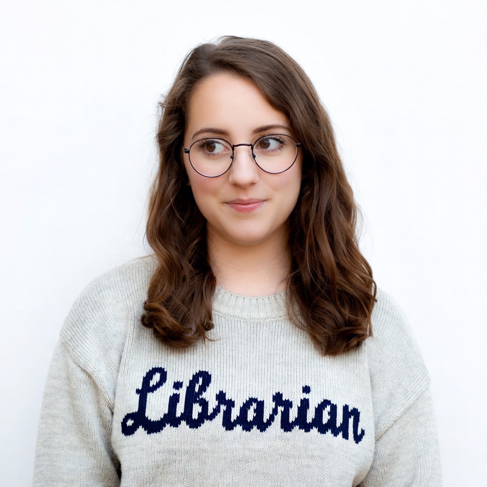 A young woman with shoulder-length wavy brown hair and round glasses smiles at the camera. She wears a light gray sweater with 'Librarian' written in large navy blue cursive letters across the chest. She stands against a plain white background.