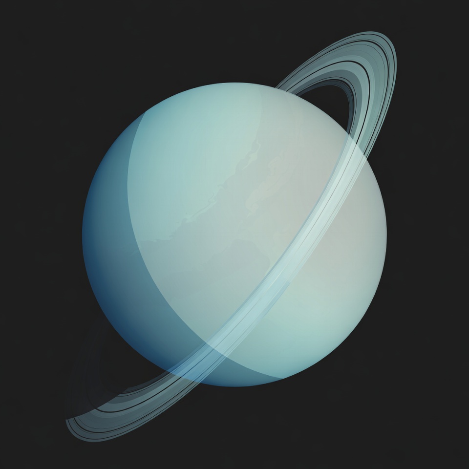 A detailed illustration of Saturn features a pale blue-green planet with prominent icy rings tilted at an angle. The rings have multiple layered bands of white and subtle color variations. The planet and rings are centered against a solid black background.