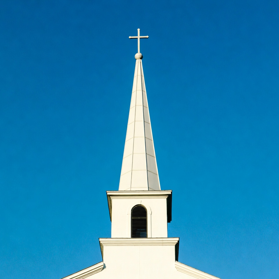 A tall white church steeple rises against a clear blue sky. A white cross sits atop the pointed spire. The base features a small arched window and white roofline.