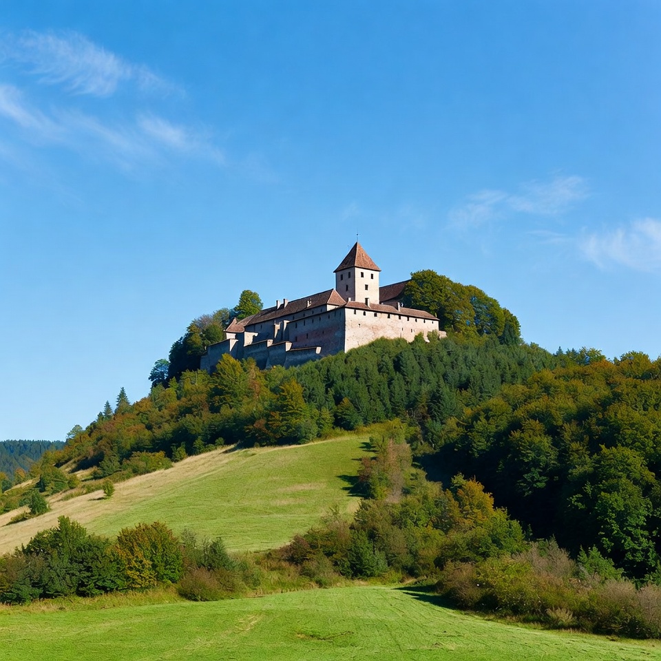 A large medieval castle with red-tiled roofs sits atop a green hill surrounded by dense forests. The structure features stone walls, towers, and a prominent central keep under a clear blue sky with scattered clouds. Lush green meadows and autumn-tinted trees cover the surrounding landscape.