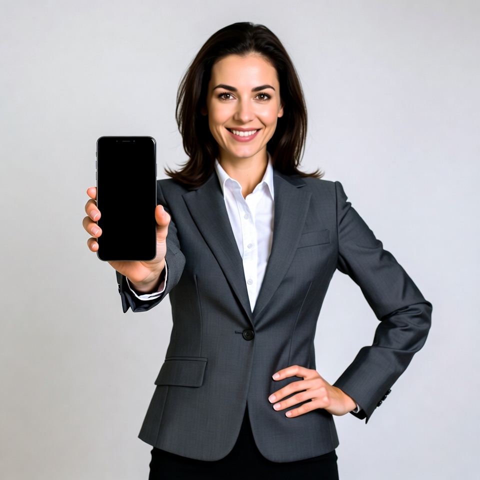 A smiling woman with long dark hair holds up a black blank smartphone with both hands. She wears a gray blazer, white collared shirt, and black pants, standing confidently with one hand on her hip against a plain gray background. Her expression is friendly and professional.