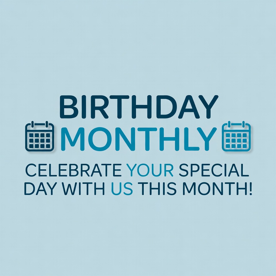 A blue-themed graphic features 'Birthday Monthly' text with calendar icons on a light blue background. The bold title is flanked by two outline calendars. Below it reads 'Celebrate your special day with us this month!' in smaller font.