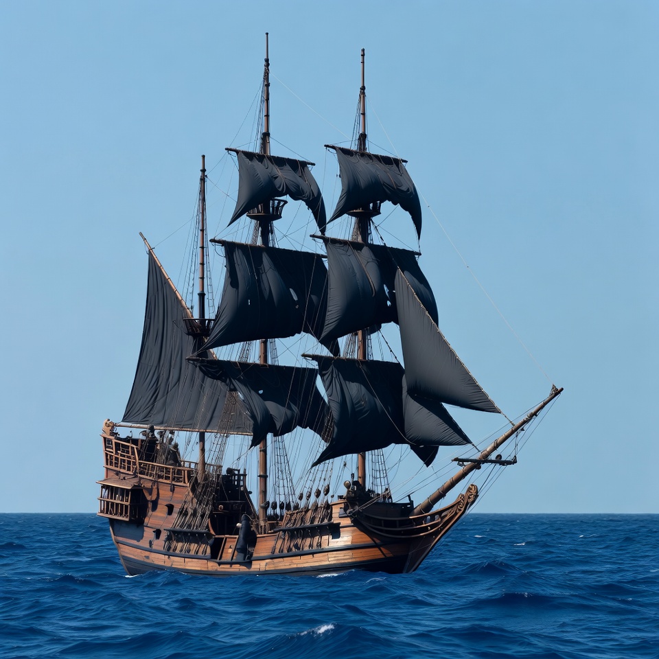 black sails, blue water, clear sky, dark sails, galleon, nautical, ocean, pirate vessel, rigging, sailing ship, sea, ship at sea, tall masts, wooden ship, pirate ship