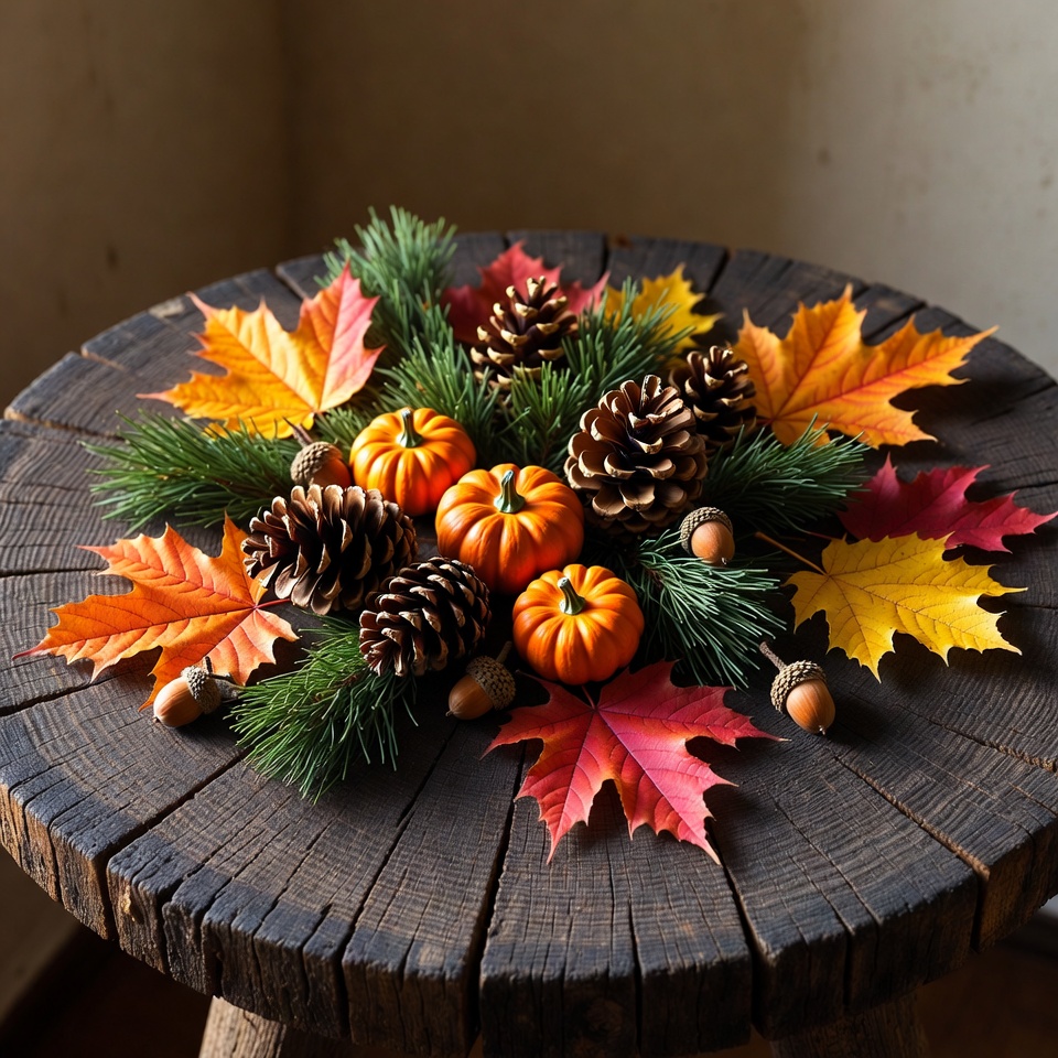 acorns, autumn arrangement, corner view, fall decor, fall leaves, fall table decor, harvest arrangement, holiday table, maple leaves, natural elements, orange leaves, orange pumpkins, pine branches, pine cones, pine greenery, pumpkins, red leaves, rustic table, seasonal decor, small pumpkins, thanksgiving decor, wood surface, wooden table, yellow leaves, autumn centerpiece