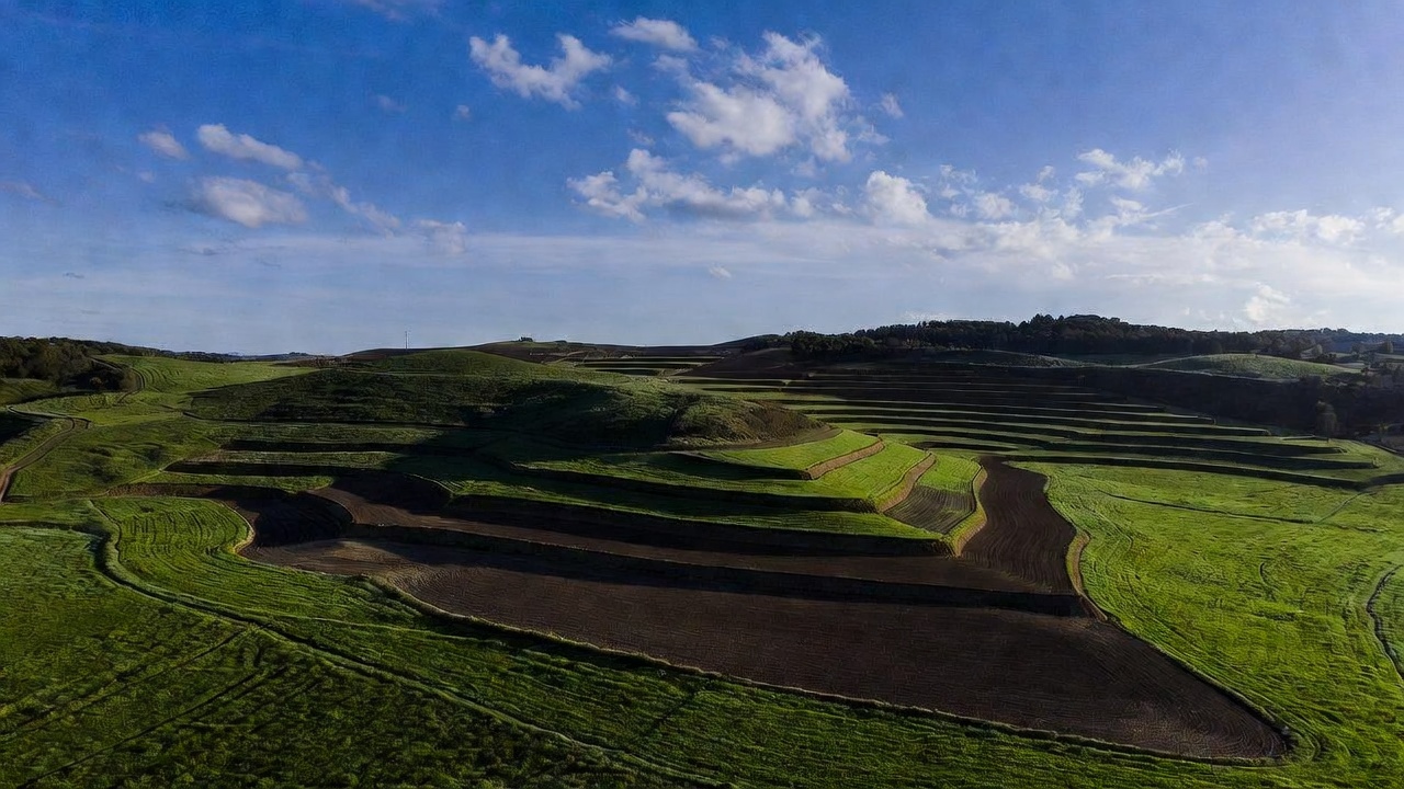 aerial view, agriculture, blue sky, countryside, drone photo, earthworks, farmland, fields, grass, green fields, hill terraces, landscape, nature, outdoors, panoramic view, ridges, rolling hills, rural landscape, scenery, slopes, soil, terrain, vibrant green, white clouds, terraced hills