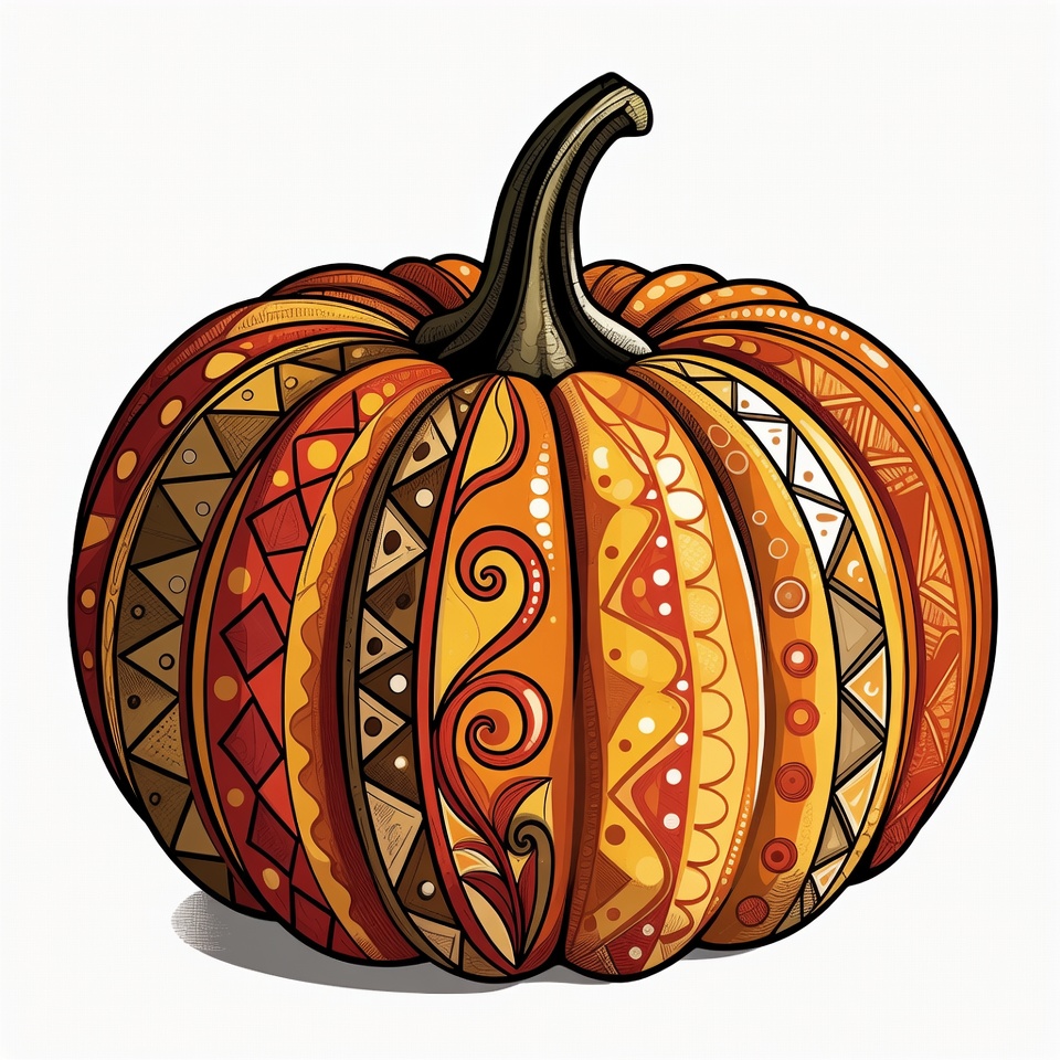 A vibrant orange pumpkin with intricate geometric and floral patterns in red, yellow, and brown tones. It features a curved green stem and detailed tribal-style designs covering its surface. The illustration is set against a white isolated background.