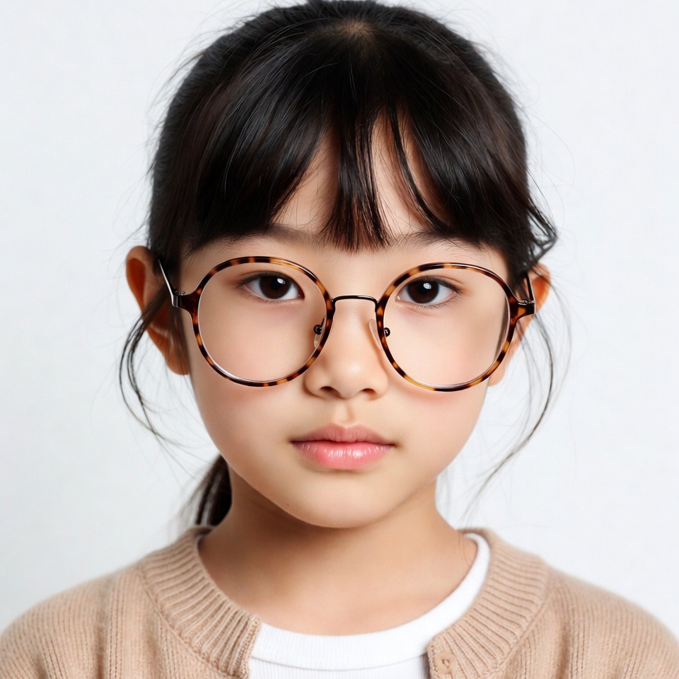 A young Asian girl with straight black hair and bangs wears large round tortoiseshell glasses. She has a neutral expression and subtle lip gloss on a plain white background. She is dressed in a beige cardigan over a white top.