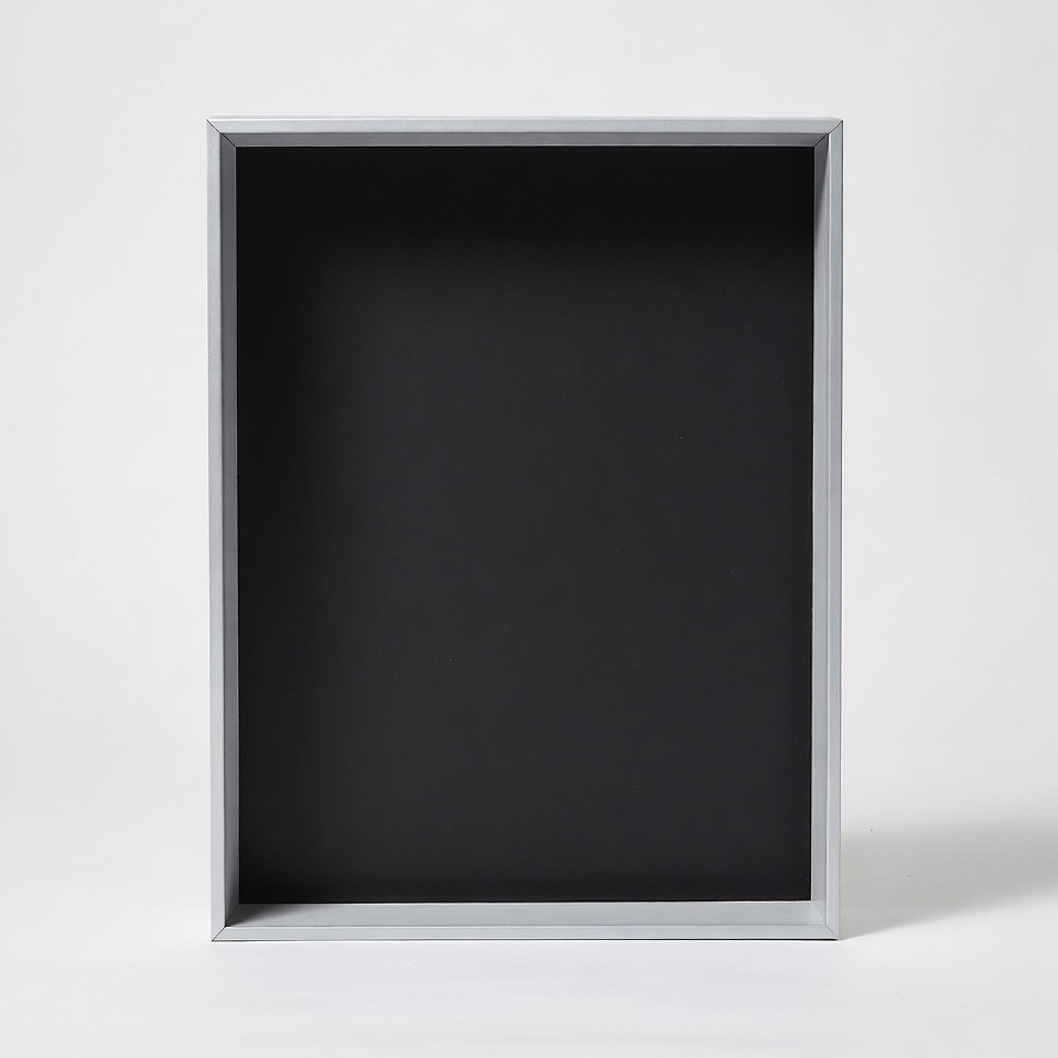 A simple rectangular picture frame with a silver metal border stands against a white background. The interior of the frame is completely empty and black. It is presented in a front-facing view with clean, straight edges.