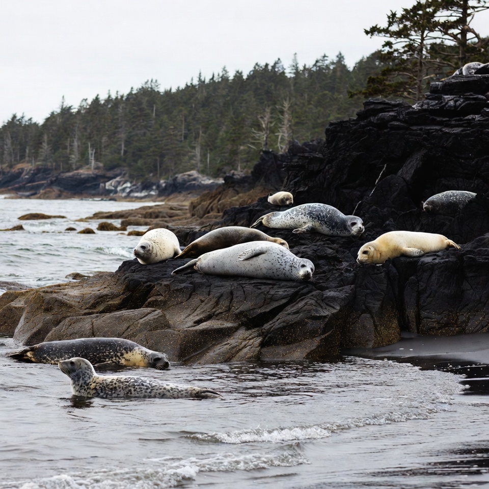 A group of harbor seals rests on black rocks along a coastal shoreline with evergreen trees in the background. Some seals are lounging on the rocks while others swim in the shallow gray water nearby. The scene features a misty ocean and rugged terrain.