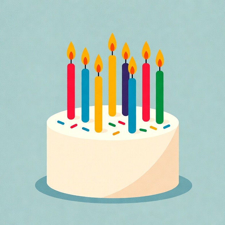 A white round cake topped with colorful candles in red, yellow, blue, purple, and green, each with lit flames. The cake has white frosting and multicolored sprinkles. It is illustrated on a light blue background.