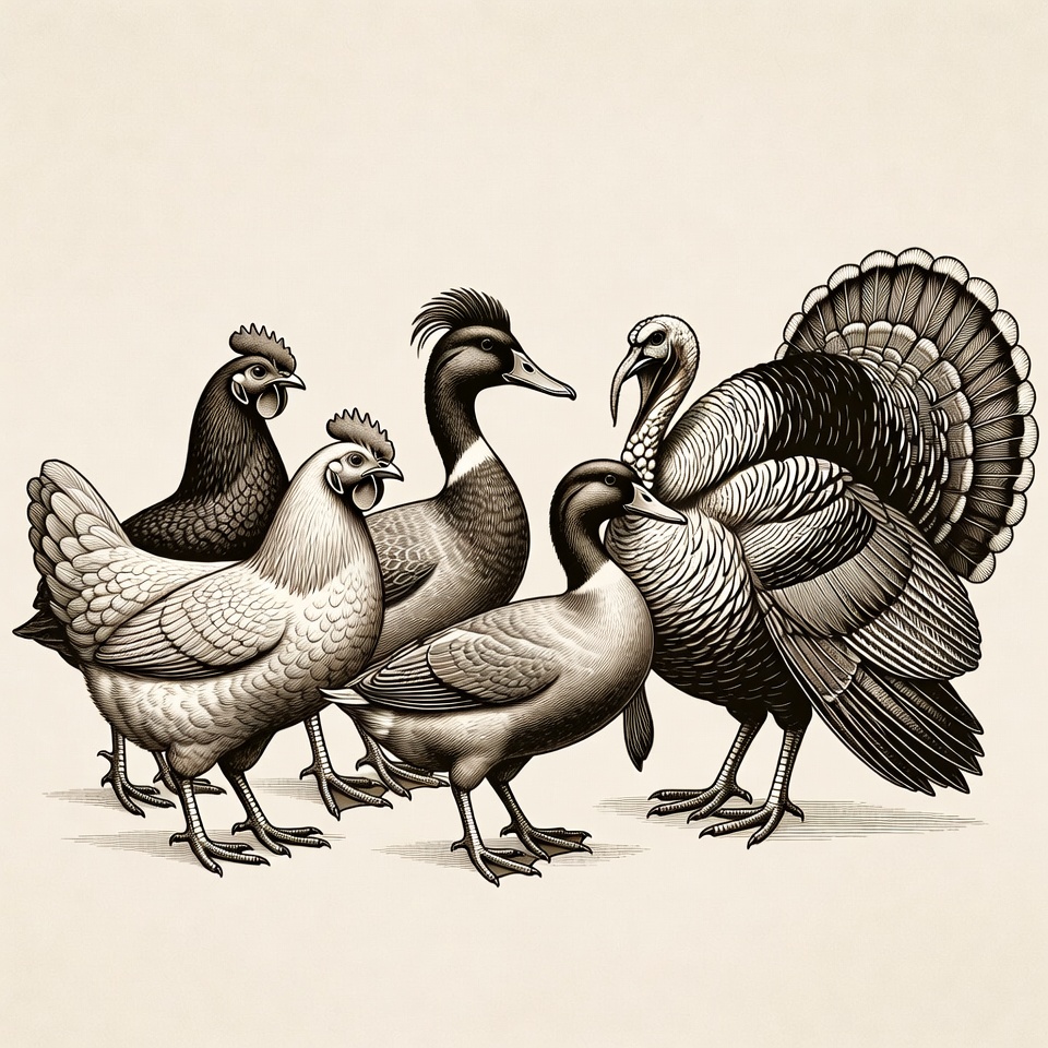 animal group, animals, bird illustration, brown hen, chicken, drake, duck, engraving style, farm animals, farm birds, feathers, group, hen, ink drawing, isolated background, line art, mallard, poultry, standing, tail feathers, turkey, white hen, illustration