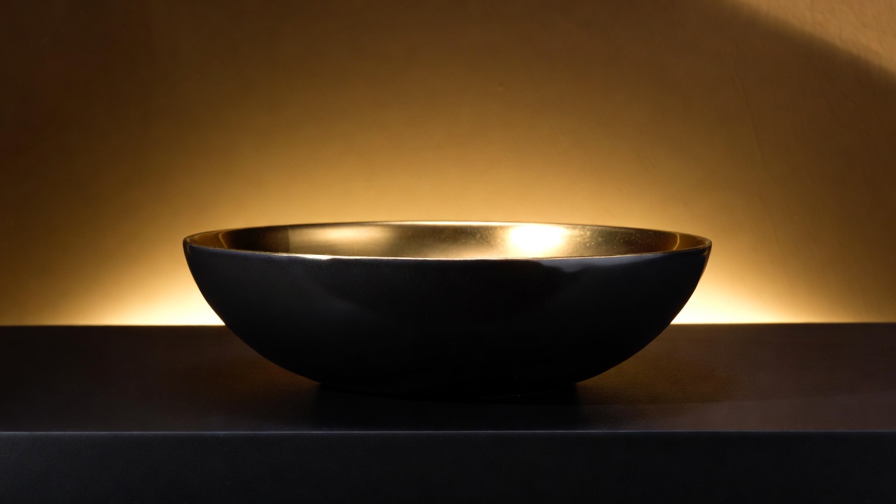 black ceramic, ceramic bowl, decorative bowl, gold bowl, gold interior, golden rim, isolated background, kitchenware, luxury bowl, shiny gold, tableware, warm lighting, black bowl