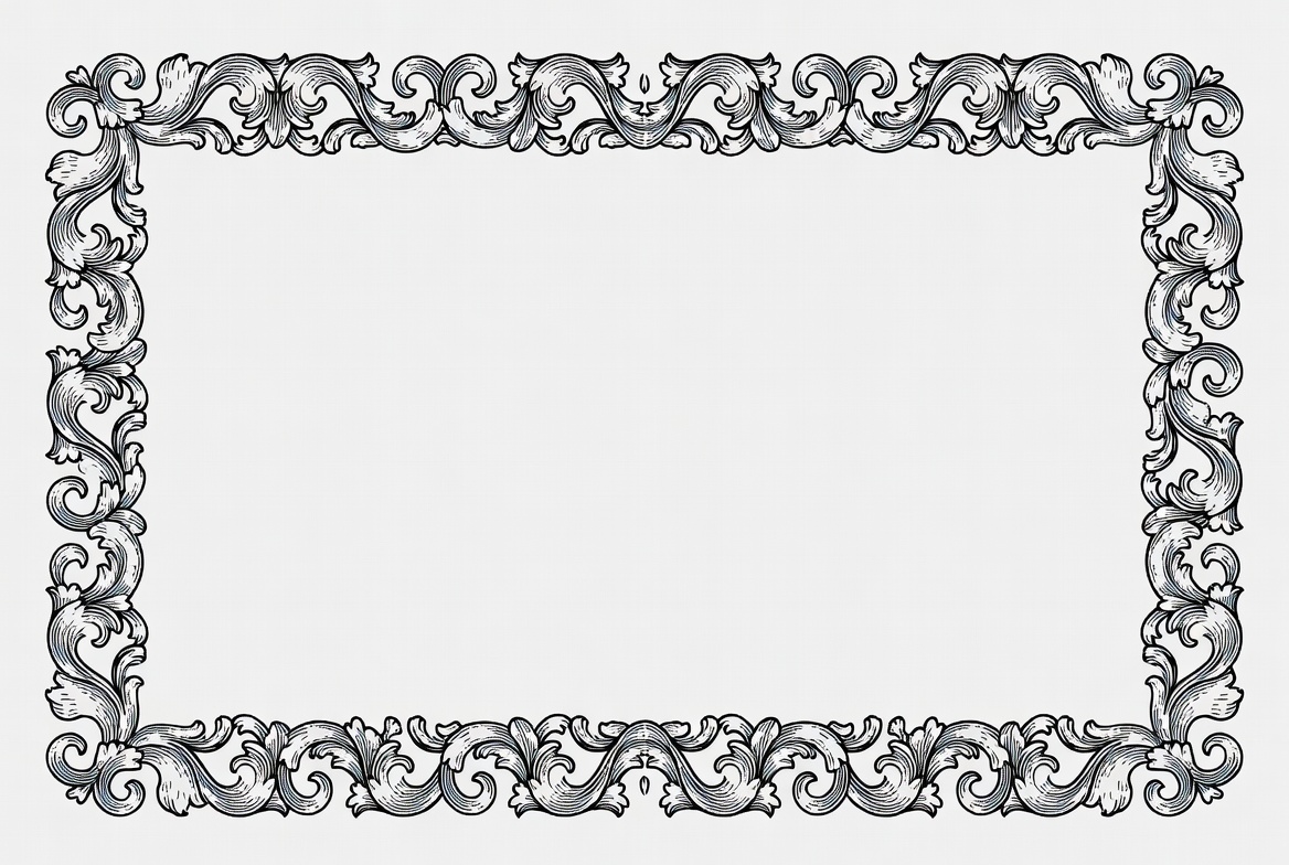 acanthus leaves, antique border, baroque frame, black white, clipart, decorative border, elegant frame, empty frame, engraved frame, filigree border, floral design, graphic element, illustration, isolated background, line art, rococo design, scrollwork, vector frame, vintage frame, ornate frame