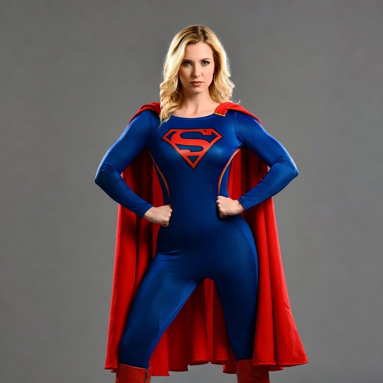 S emblem, White, blonde hair, blonde woman, blue costume, comic hero, cosplay, female, gray background, hands on hips, powerful stance, red boots, red cape, standing pose, superhero, tight bodysuit, woman, Supergirl