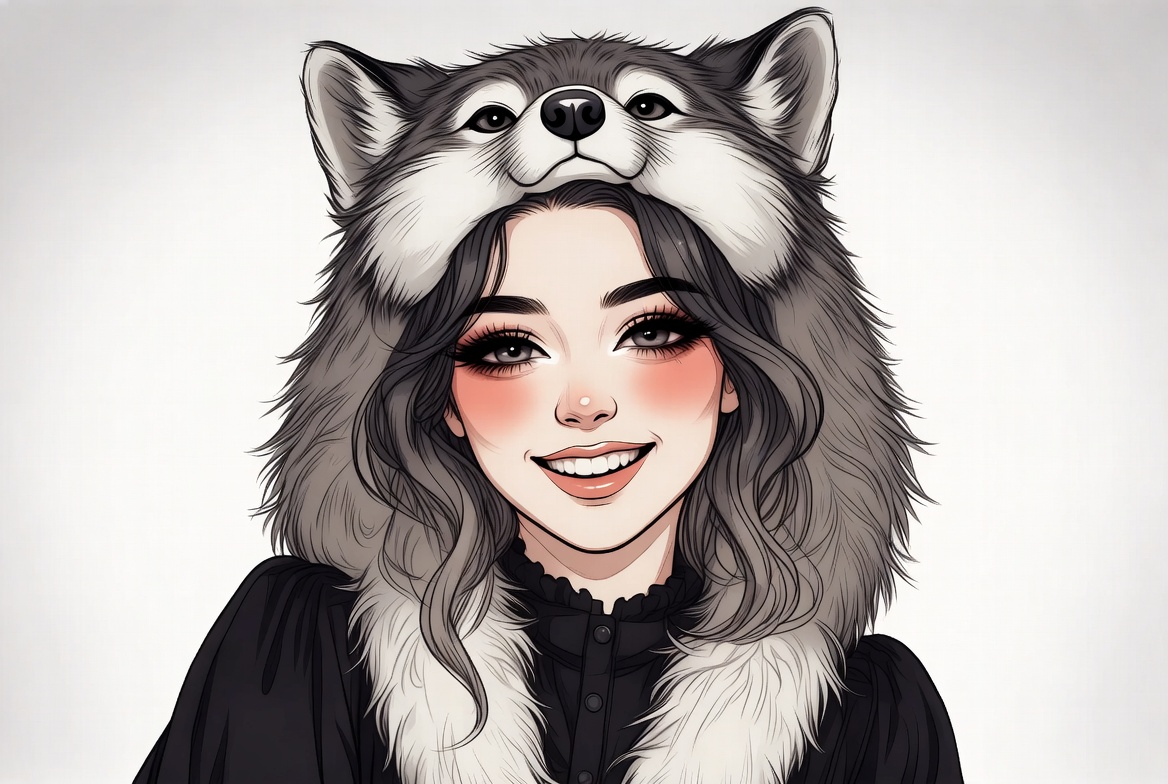 An illustration of a young woman with wavy hair smiling while wearing a fluffy gray wolf hood over her head. She has expressive eyes with pink blush and wears a black collared dress. The artwork features a clean white background.
