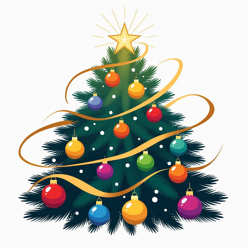 A vibrant illustrated Christmas tree stands on a white background with multicolored ornaments hanging from its branches. Golden ribbons wrap around the tree, and a shining gold star sits at the top. The tree features green needles and a variety of round baubles in red, blue, yellow, green, and purple.