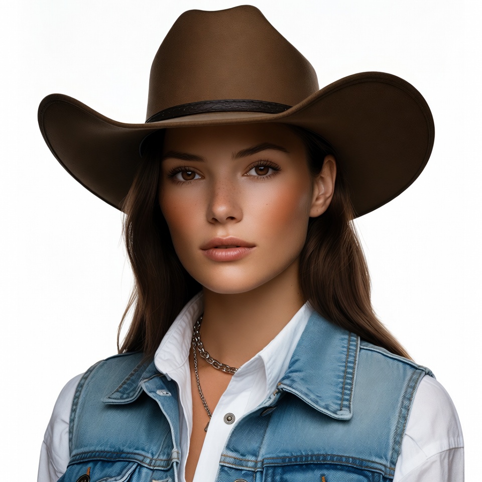 White, brown hat, cowboy hat, dark hair, denim vest, fashion, female, headshot, isolated background, long hair, portrait, silver necklace, western style, white shirt, wide brim hat, woman