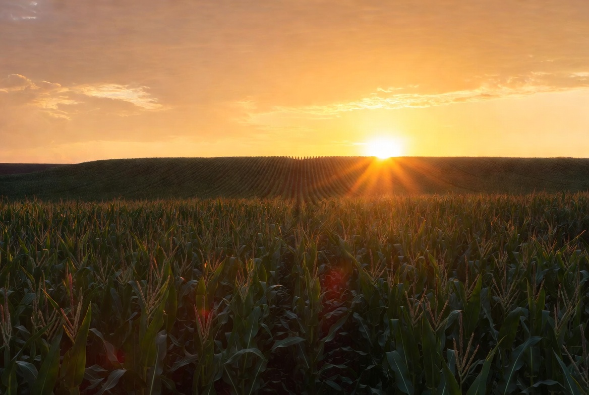 A vibrant sunset illuminates a vast cornfield with rows of green corn stalks stretching to the horizon. The sun's golden rays burst through the plants, casting a warm glow across the landscape. Clouds in the sky add texture to the dramatic evening scene.