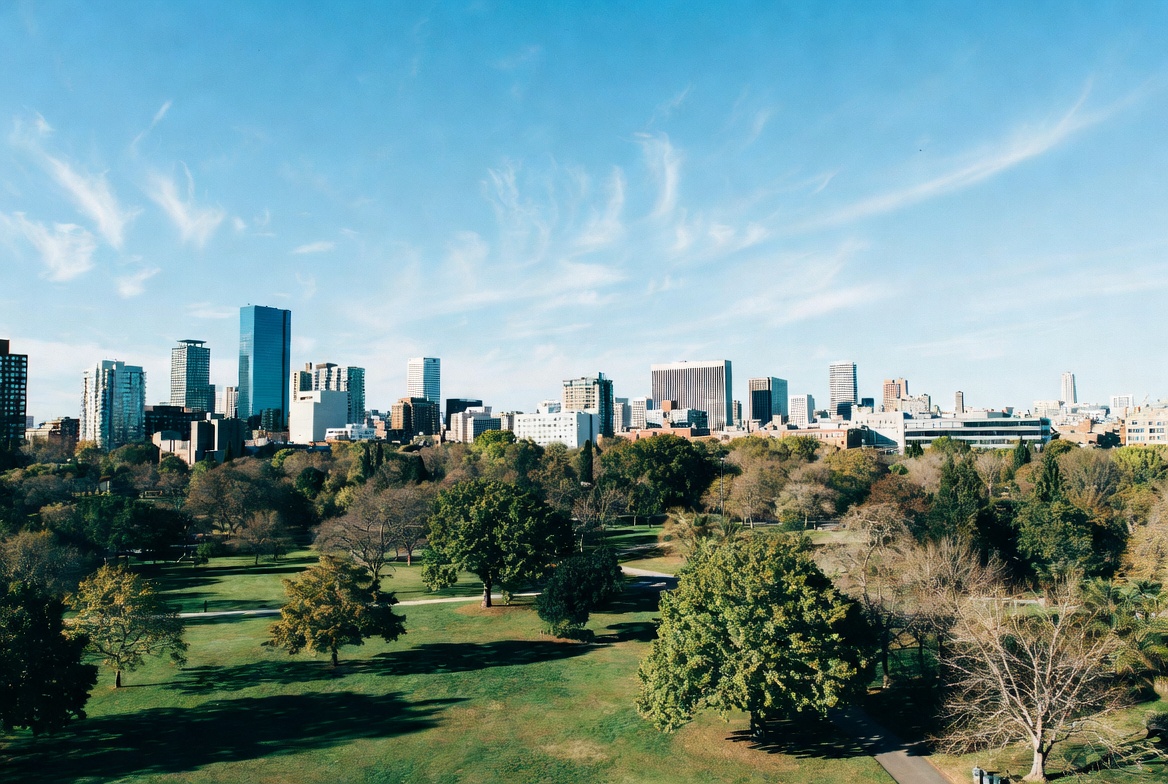 autumn trees, blue sky, cityscape, clouds, daylight, fall foliage, foliage, green grass, horizon, landscape, modern buildings, nature, outdoor, panorama, park, shadows, skyscrapers, trees, urban landscape, walking path, city skyline