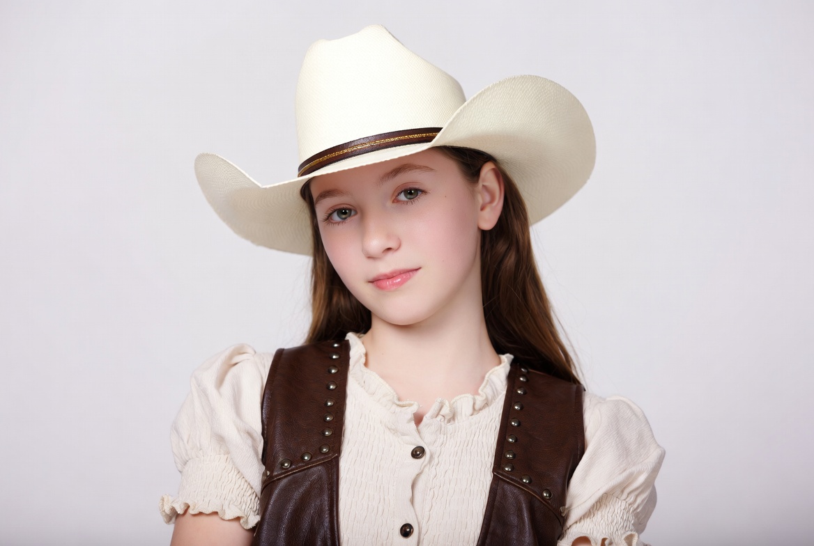 A young girl with long brown hair stands smiling against a white background. She wears a large white cowboy hat with a brown band and a brown leather vest over a white ruffled blouse. Her expression is friendly and she looks directly at the camera.