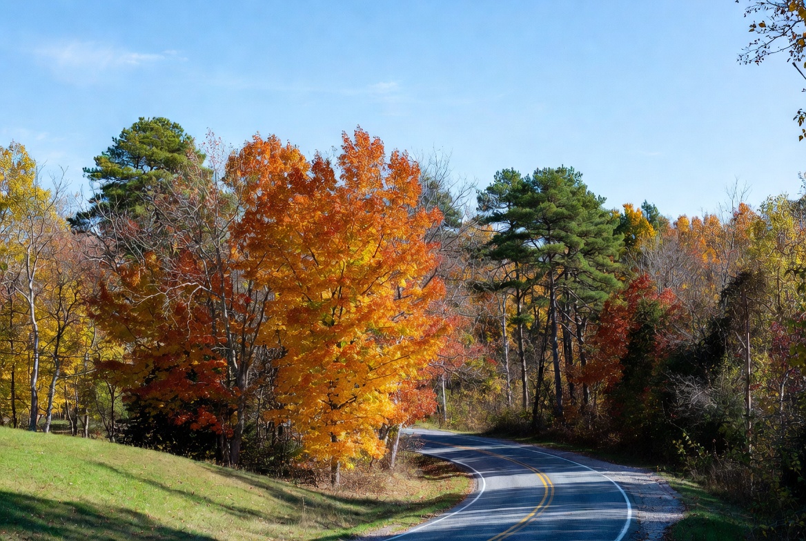 autumn colors, blue sky, colorful leaves, curvy road, fall foliage, fall trees, forest, grassy hill, landscape, nature, orange leaves, paved road, pine trees, red leaves, scenic road, sunny day, trees, winding road, woods, yellow leaves, autumn