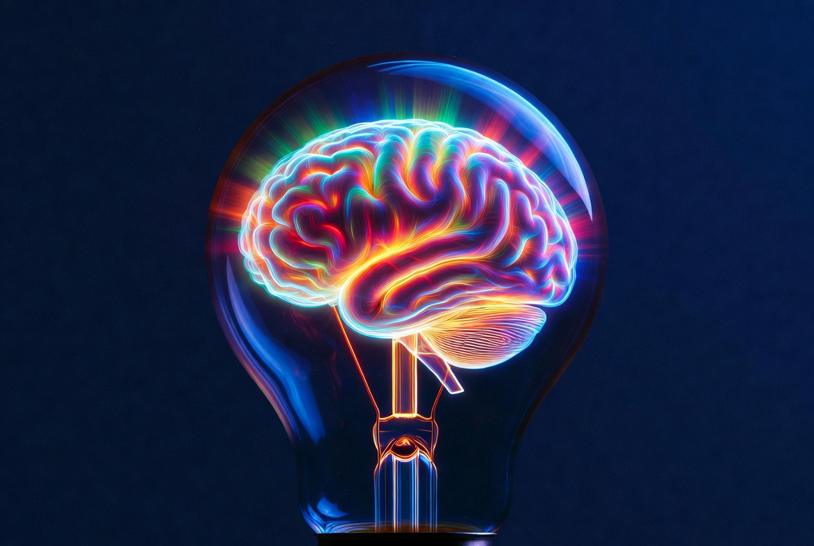 A vibrant, neon-colored human brain glows inside a transparent glass light bulb. The brain features multicolored neural patterns in pink, blue, purple, and green hues against a dark blue background. Radiant light emanates from the bulb, symbolizing creativity and intelligence.